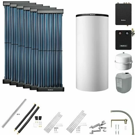 Buderus Solarpaket Logaplus S83 mit 6x Logasol SKR10 CPC 7,32 m² zur Aufdachmontage, Pufferspeicher PNR 725 l weiß, Frischwasserstation Logalux und Solarstation
